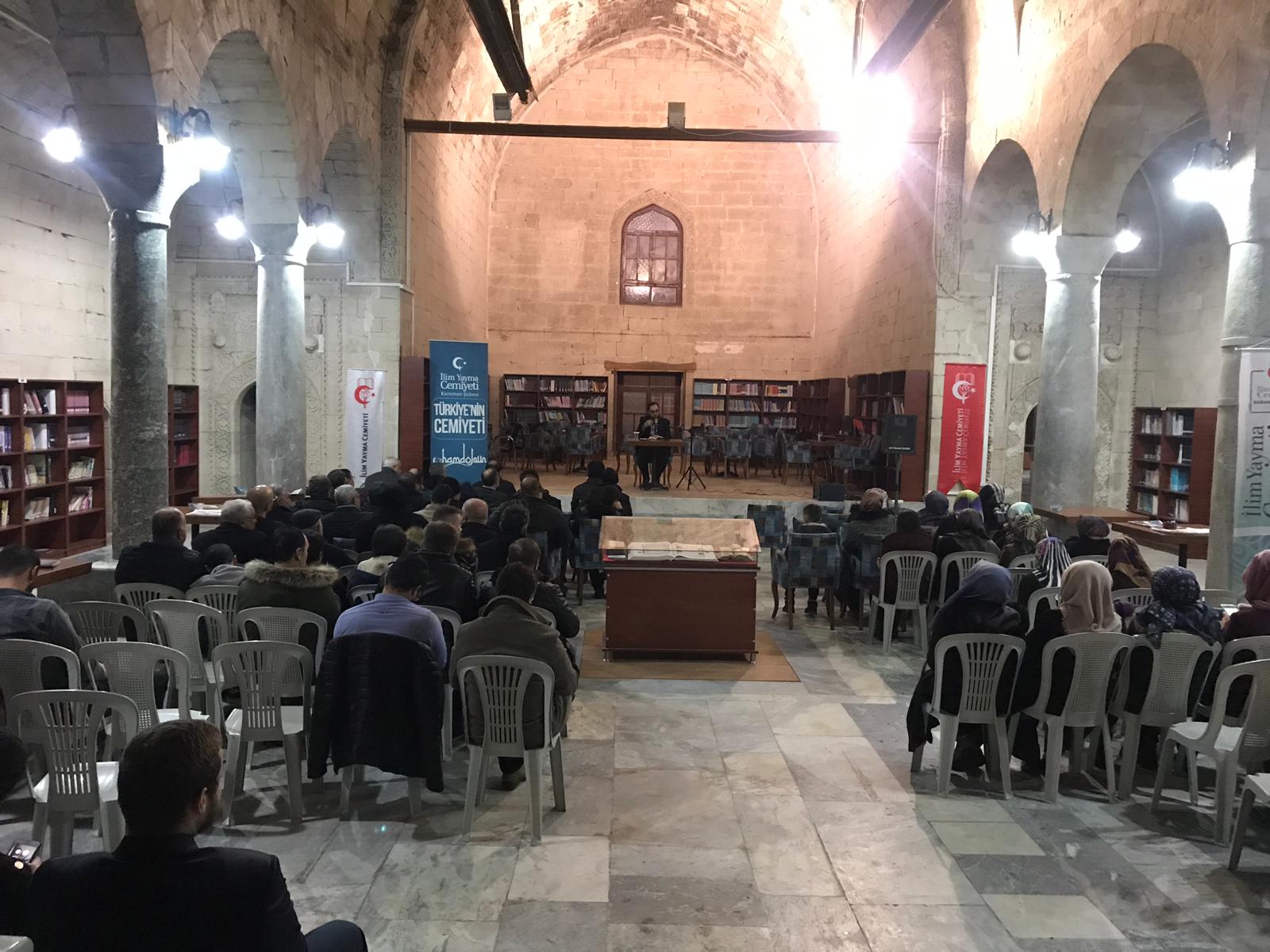 İlim Yayma Cemiyeti Karaman Şubesi tarafından her hafta pazartesi günü saat 20:00 de Hatuniye Medresesinde düzenlenen medrese söyleşileri bu hafta Karamanoğlu Mehmet bey Üniversitesi İslami ilimler fakültesi araştırma görevlisi Yusuf Erdem Gezgin’i misafir etti. Hadis dersinin yapıldığı söyleşide Gezgin, programa hadisin ve Sünnet’in ne olduğu konusuna değinerek başladı. Hadis derslerinin takip edileceği eserin müellifi olan imam Nebevi’nin hayatı ve eserleri hakkında geniş malumat verildi. 18 yaşında başladığı ilim yolculuğunda 42 yıllık kısa ömründe 60’a yakın eser bırakan ve eserlerinin birçoğu ciltlerce olan İmam Nevevi’nin bereketli bir hayat geçirdiğine değinildi. Ardından Müslümanın hayatında niyetin yeri ve önemi ile devam eden söyleşi Allah Rasulü’nden niyet ile ilgili söylenmiş hadisler anlatılarak devam etti. Önümüzdeki hafta pazartesi günü il müftülük vaizi Hasan Acar tefsir dersiyle Hatuniye (Millet Kıraathanesi) Medresesinde vatandaşlarımızla biraraya gelecek. Programlarmıza tüm Karaman halkı davetlidir.