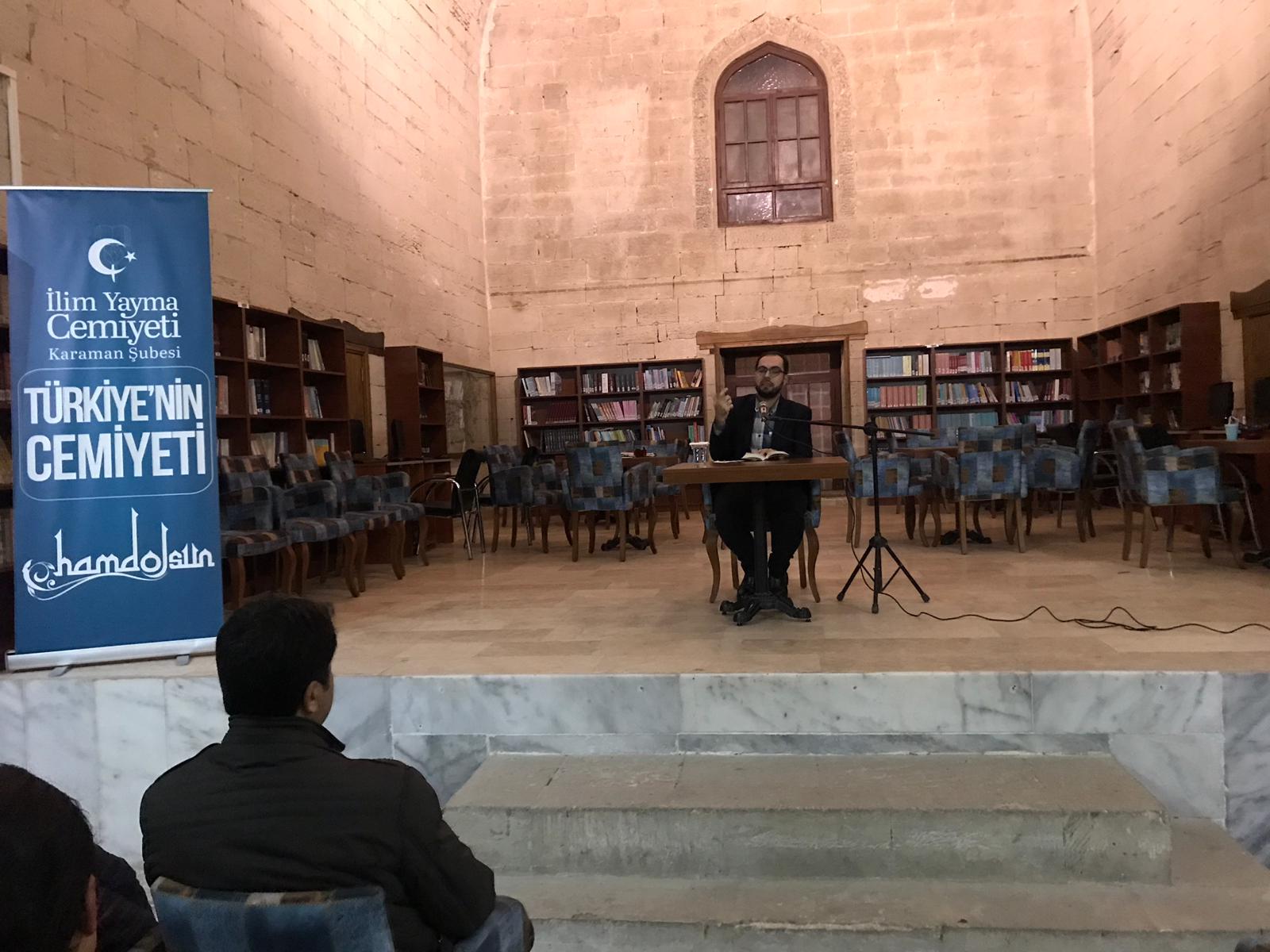 İlim Yayma Cemiyeti Karaman Şubesi tarafından her hafta pazartesi günü saat 20:00 de Hatuniye Medresesinde düzenlenen medrese söyleşileri bu hafta Karamanoğlu Mehmet bey Üniversitesi İslami ilimler fakültesi araştırma görevlisi Yusuf Erdem Gezgin’i misafir etti. Hadis dersinin yapıldığı söyleşide Gezgin, programa hadisin ve Sünnet’in ne olduğu konusuna değinerek başladı. Hadis derslerinin takip edileceği eserin müellifi olan imam Nebevi’nin hayatı ve eserleri hakkında geniş malumat verildi. 18 yaşında başladığı ilim yolculuğunda 42 yıllık kısa ömründe 60’a yakın eser bırakan ve eserlerinin birçoğu ciltlerce olan İmam Nevevi’nin bereketli bir hayat geçirdiğine değinildi. Ardından Müslümanın hayatında niyetin yeri ve önemi ile devam eden söyleşi Allah Rasulü’nden niyet ile ilgili söylenmiş hadisler anlatılarak devam etti. Önümüzdeki hafta pazartesi günü il müftülük vaizi Hasan Acar tefsir dersiyle Hatuniye (Millet Kıraathanesi) Medresesinde vatandaşlarımızla biraraya gelecek. Programlarmıza tüm Karaman halkı davetlidir.